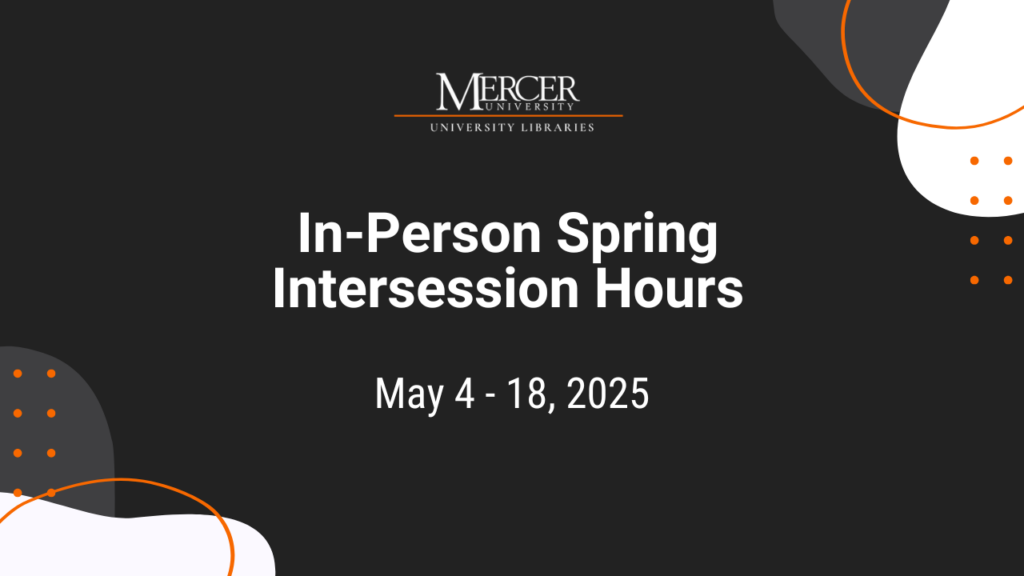 The Mercer University Libraries will alter our in-person hours for Spring Intersession from May 4, 2025 through May 18, 2025.