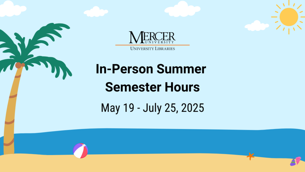 The Mercer University Libraries will alter our in-person hours for Fall Intersession from December 14, 2025 through December 23, 2025.